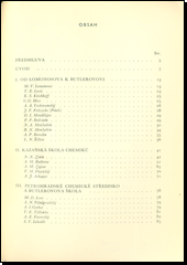 Obraz rozvoje organické chemie na Rusi od reforem Petra Velikého a založení petrohradské Akademie nauk až do Veliké říjnové revoluce a rozmachu věd v SSSR. Autor načrtává stručné biografie a ocenění významu více než padesáti chemiků-organiků, které sdružuje podle nejdůležitějších pracovních středisek, respektive škol. Text doprovází deset portrétů představitelů ruské organické chemie, z nichž zvl. jména M.V. Lomonosov, D.I. Mendělejev a A.M. Butlerov stala se světovými. Charakteristiku autora, který je sám vynikajícím chemikem, podává akademik A.N. Nesmějanov.