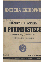 Cicerov život poznáme do takých podrobností, ako nepoznáme život žiadneho antického človeka. Zachovalo sa množstvo jeho spisov, jeho súdnych a politických rečí, veľká časť jeho rétorických a filozofických spisov a mnoho jeho listov. Mnohé Cicerove spisy nám dovoľujú nahliadnuť hlboko do jeho mysle aj vo chvíľach našej slabosti. Z filozofických diel sa vyníma práve spis De officiis, ktorý ma dialogickú formu. Cicero v ňom nenásilne zoznámil s protichodnými názormi rôznych škôl. Knihu O povinnostiach napísal Marcus Tullius Cicero v poslednom roku svojho života. Spis sa stal jeho mravným odkazom nielen synovi Markovi, ktorému De officiis venoval, ale aj neskorším generáciám. Cicero nemohol tušiť, aký osud bude mať jeho kniha. V knihe prvej, chcel Marka najprv učiť, čo je to povinnosť. Tento pojem rozdelil na dve základné otázky, jednak na určenie najvyššieho dobra, jednak na pravidlá, ktorými by sa po všetkých stránkach mala riadiť spoločnosť v živote. Pravidlá smerovali k usporiadaniu spoločenského života a o nich podal výklad v tomto spise synovi Markovi. Marcus Tullius Cicero často vo svojej prvej knihe spomína dobročinnosť a štedrosť, chcel aby sa dobročinnosť dostávala podľa toho, ako si kto zaslúži. Pomáhať sa má najskôr tomu, kto pomoc najviac potrebuje a mali by sme dbať na to, aby štedrosť prospievala priateľom a nikomu neškodila. Ľudské pokolenie je samo o sebe prirodzeným základom pre spoločenské vzťahy. Je veľmi potrebné zachovávať spoločenstvo všetkých vecí, ktoré stvorila príroda, k užívaniu ľuďom. V knihe druhej sa Marcus Tullius Cicero venoval povinnostiam, ktoré sa vzťahujú k vnútornému zušľachteniu života, k získaniu vecí potrebných pre ľudí, k moci a bohatstvu. Ide mu tu o otázku čo je prospešné a čo nie. Cicero obetoval všetky svoje myšlienky obci, pokiaľ bola spravovaná tými, do rúk ktorých sa zverila sama. Zaoberal by sa vtedy politickými rečami, avšak, keď obec začal spravovať samovládca, nevidel východisko v nečinnosti, ale vo filozofii, ktorou sa zaoberal od samej mladosti. Uprostred najväčšieho nešťastia dosiahol aspoň to, že ľuďom vyložil málo známu náuku - filozofiu. „A ľudia, ktorí o ňu usilujú, volajú sa filozofovia a filozofia, ak chceš toto slovo preložiť, nie je teda nič iného ako láska k múdrosti.“ V tretej knihe Marcus Tullius Cicero písal, že bol ozbrojeným, zločinným spôsobom vylúčený z politického života a z účasti na verejných záležitostiach, musel opustiť mesto a cestoval po svojich vidieckych statkoch, nie kvôli túžbe po odpočinku, ale preto, lebo utekal pred zločincami, skrýval sa a bol sám, bol verejne nečinný. V samote obrátil všetku snahu k spisovateľskej činnosti a za krátku dobu napísal viac ako za mnoho rokov. Vo svojom poslednom spise pre Marka písal, že Panaitios stanovil tri druhy prípadov, kedy sa ľudia radia a uvažujú o povinnosti. Keď sú na pochybách či je čin čestný a či nie, keď sú na pochybách či je čin prospešný a či nie, a keď je potrebné sa rozhodnúť, keď jednanie sa javí čestným, či je rozpore s jednaním prospešným. Všetky prípady spomenul Panaitios vo svojich troch knihách, okrem posledného. Nedá sa však pochybovať podľa Cicera o tom, že nikdy nemôže byť prospešnosť v rozpore s čestnosťou. Tie povinnosti o ktorých Marcus Tullius Cicero hovorí, nazvali stoikovia strednými povinnosťami. Mnoho ľudí k nim dospieva prirodzenou cestou, dobrotou svojej povahy. Sú to akési cnostné činy, ktoré sú spoločné všetkým ľuďom. O pravej čestnosti platí, že sa nemôže dostať do sporu s prospechom, čestnosť v jednoduchom zmysle slova sa nikdy nemá merať vnútorným prospechom. Na ceste k pokroku, po ktorej smerujeme k cnosti musíme zachovávať a pestovať čestnosť. Ľudia, ktorí si takto počínajú sú podľa Cicera pokladaní za poctivých, pretože si plnia svoje povinnosti. Marcus Tullius Cicero poslal „tento veľký dar“, tri knihy synovi Markovi so slovami, že jeho cena bude závisieť na tom, ako ho užije. Kázal mu prijať jeho knihy len ako hosťa medzi prednášky veľkého učiteľa Krattipa, ktorý bol učiteľom školy peripatétikov. Mal týmto spisom venovať toľko času, koľko bude môcť, a bude môcť toľko, podľa Cicera, koľko bude chcieť. „Buď teda zdravý, môj Mark, a buď presvedčený, že si mi veľmi drahý, ale že mi budeš ešte drahší, ak sa ti zapáči v týchto poučeniach a zásadách.“ Na záver musím dodať len toľko, že De officiis nestratilo na svojej aktuálnosti za celý ten čas vôbec nič. Naopak, je to dielo čím ďalej tým viac aktuálne. Je paradoxné, že v 21. storočí, keď sme si zvolili za spôsob spoločenského zriadenia demokraciu, že obchádzame myšlienky, ktoré k demokracii viedli, respektíve, ktoré slúžili ako podporná stavba demokracie, bez ktorých by toto spoločenské zriadenie nemohlo existovať. Je taktiež zvláštne, že pri voľbe našich zástupcov nepožadujeme od nich znalosť a schopnosť aplikácie princípov popísaných v De officiis ale akceptujeme „súťaž krásy“ v klamaní vo volebných programoch, za ktoré nikto z nich nenesie zodpovednosť. Myslím si, že ktokoľvek, kto pomýšľa na akúkoľvek verejnú pozíciu, nech je akokoľvek nízka, by mal prezentovať znalosti obsiahnuté v tejto knihe. Myslím, že spis De officiis je veľkým darom pre všetkých na Zemi a bol by veľkým plusom v knižnici každého novodobého politika.
