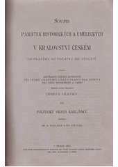 Abecedně řazený ilustrovaný soupis umělecko-historických památek karlínského správního okresu vytvořený v letech 1898-1901.Do soupisu jsou pojaty památky prehistorické a památky umění stavitelského, sochařského a malířského od románské doby do počátku 19. stol., předměty uměleckého průmyslu, pokud nejsou v soukromém vlastnictví, stavby historicky důležité, jako hrady, opevnění, mosty aj. 379 obr., fot. a půdorysů. 8 barev. vyobrazení. Seznam 85 zmiňovaných míst. Rejstřík jmen umělců a řemeslníků. Odborná literatura u jednotlivých hesel.