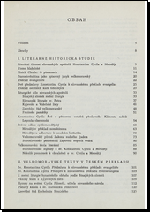 Český překlad staroslověnštinou, nejstarším spisovným jazykem slovanským, psaných literárních památek období velkomoravského (z mešní liturgie byzantského obřadu podle Sinajských zlomků, ukázky textů z Kyjevských listů, Zakon sudnyj ljudem, Život sv. Konstantina Cyrila, Život sv. Metoděje, Legenda chersonská aj.). Doplňuje jej obsáhlá literárněhistorická studie a množství reprodukcí nejvýznamnějších pomátek.
