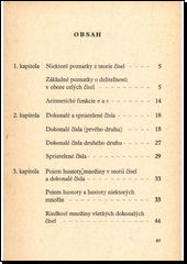 Z teorie čísel probírá autor čísla, která se rovnají součtu všech svých pravých dělitelů, tj. dokonalá čísla prvého druhu a čísla, která se rovnají součinu všech svých dělitelů, tj. dokonalá čísla druhého druhu. Zabývá searitmetickými vztahy dvojic číselných jako jsou dvojice Pytagorovy, Descartovy, Fermatovy, Eulerovy a celá řada jiných dvojic vázaných zákony dělitelnosti. Výklady se opírají o teorii číselných množin, věnují pozornost pojmuhustoty množiny v teorii čísel se zřetelem na čísla dokonalá a řídkosti množiny všech dokonalých čísel.