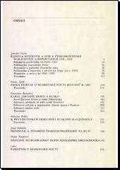 Sborník hodnotí svými osmi dílčími příspěvky projevy česko-ruských vztahů, které se utvářely v 19. a 20. století. Autory článků jsou J. Vávra, V. Žáček, V. Bechyňová, M. Bidlas, J. Schánilec, M. Tarantová a J. Strnadel.Tématem prací je publicistický a reportážní ohlas bolševického Ruska v Československu během let 1918-1929, souvislosti moskevské pouti Slovanů r. 1867, Erbenův poměr k Rusku, první české diskuse s ruskými slavjanofily, působení českých pedagogů na Rusi, činnost hudebníka Alexandera Dreyschocka a zvážení historického významu Slovanské knihovny. Kniha poskytuje částečný obraz dlouhodobé spolupráce kulturních pracovníků obou zemí na společném kulturním ipolitickém vzestupu.