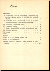 Právní předpisy o organizaci chatařů a jejich spolupráci s MNV, výstavbě chat a zásobování vodou, pojištění a ochraně chat, finančních problémech, zemědělských otázkách, rybolovu, myslivosti a ochraně přírody. Přílohy otiskují Vzorový osadní řád a Směrnice k řízení a provádění rekreační výstavby ve Středočeském kraji.