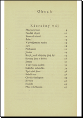 Sbírka veršů, prvně vydaná r. 1921, má tři části. V první, nazvané Zázračný máj, vrací se básník srdcem do svého rodného kraje, oslavuje jaro v přírodě, ale i hmatá ruch světa, tvorbu a čin. Ve druhé části sbírky nazvané Pokojné výšiny zesiluje složka reflexivní a ztišení. V poslední části Chvíle pokory básníkův výraz se oprošťuje od všeho, uvolňuje až k písňové formě a otevřenému přiznání nad zklamanými a zničenými iluzemi, leč s novou vírou v budoucnost a v moudrý smír.
