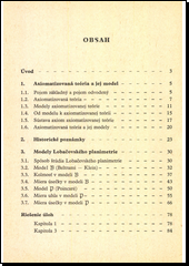 Planimetrie Lobačevského je v knížce probírána s použitím axiomatizované teorie a jejího modelu. Autoři se zabývají modelem Beltrami-Kleinovým a Poincaréovým. V Beltramiho modelu studují kolmost a míru úsečky, na Poincaréověmodelu vysvětlují jak míru úsečky, tak i míru úhlu. Speciální poznatky potřebné ke studiu spisku uložili autoři v dodatku. V něm vykládají některé pojmy z teorie množin a z matematické logiky, dále větu Pappovu a některé věty okružnici, zvláště mocnost bodu ke kružnici.