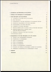 Spis obsahuje úvod a vymezení problému, nástin vývoje archeografie, základní popis a jeho postupy. Dále se pojednává o systému v archeografii, klasifikaci prostoru, času, tvaru, schématech, utváření a zkoušení archeografickýchkonceptů a hypotéz.