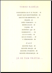Pod společným titulem jsou shrnuty tří básnické sbírky. První z nich, "Torso naděje", vznikla r. 1938 a básník v ní odsoudil zradu spáchanou na českém lidu, zpíval o jeho utrpení i ponížení a o víře ve vítězství. K této sbírce jsou připojeny "Časy", vydané původně jako novoročenka. Druhou sbírkou "Já se tam vrátím" autor vyznal svou lásku k rodné Českomoravské vysočině. Sedmnáct básní sbírky "Naše paní Božena Němcová" si všímá charakteristických momentů ze života české básnířky a oslavuje její hrdinství i utrpení.