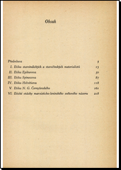 Vybrané kapitoly o etice staroindických a staročínských materialistů, o etice Epikurově, Spinozově, Helvétiově a Černyševského, zdůvodněné filosoficky a společensky, ukazují boj materialismu s idealismem v různých obdobích. V závěrečné stati o etice marxisticko-leninského světověho názoru je poukázáno na přímou souvislost s velkými materialisty minulosti, jejichž názory dovršuje.