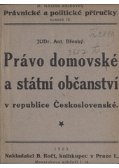 BŘESKÝ, Antonín. Právo domovské a státní občanství v republice Československé. V Praze: B. Kočí, 1923. 158 s. Knihovna B. Kočího. Právnické a politické příručky, sv. 10.