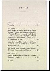 Mladý čes. literární historik a kritik sleduje v období osmi století, "jaký ohlas nalezla existence" Moskvy "v českém původním písemnictví". Vychází od prvých zmínek a zpráv o Moskvě v čes. prostředí ve 12.st.,podrobněji probírá začátky novodob. styků česko-ruských v obrození, v době nástupu čes. měšťanstva a dělnické třídy. Závěrem pojednává o revoluční Moskvě sovětské a svou studii končí "v předvečer 2. svět. války". Připojen soupis studované literatury.