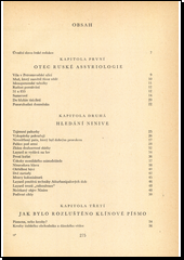 V jedenácti rozsáhlých kapitolách věnují se sovětští autoři historii objevení a vysvětlení klínového písma. Od samých počátků namáhavé práce archeologů až po vědecké rozluštění hliněných tabulek, které umožnilyodhaleníživota,uměníi společenského zřízení národů v říších dávno zapadlých, obývajících starý Přední Orient. Obsah: I. Otec ruské assyriologie, II. Hledání Ninive, III. Jak bylo rozluštěno klínové písmo, IV. Za slávu ruské sovětskévědy,V.Dělník, kterýse stal světovým vědcem, VI. Jak vznikaly hliněné knihy, VII. Pán ninivské knihovny a jeho doba, VIII. Báje a pověsti davné Mezopotamie, IX. Exaktní a přírodní vědy, X. Lékářství a farmakologie, XII. Zákonyotrokářů.