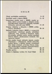 Úkoly sovět. soudnictví. Sovět. soud a ústava. Organisace soudní moci. Orgány obžaloby a obhajoby. Základy trestního řízení v SSSR a ve svazových republikách. Civilní soudní řízení. Soudní správa. - V doslovu podává dr. J. Eliáš vývojový přehled, porovnává soudnictví sovětské s naším.