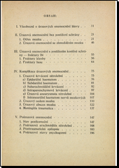 Obsahuje: všeobecné pojednání o úrazových onemocněních hlavy, o úraz. onemocněních bez postižení schrány, o frakturách lbi, o komplikacích úraz. onemocnění, o onemocněních poúrazových a dodatek (elektroencefalografie úraz. onemocnění, posuzování, prac. schopností po úrazu).