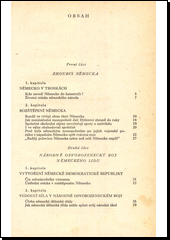 Důkladná politická studie podává rozbor poměrů v obou částech Německa od konce druhé světové války do současnosti. Líčí vznik Německé demokratické republiky a úlohu dělnické třídy při budování prvního demokratického státu na území Německa, úspěchy hospodářské výstavby, životní poměry a vymoženosti na poli sociálním i kulturním. Probírá též charakteristické rysy Německé spolkové republiky a rýsuje cestu ke sjednocení Německa jako země míru.