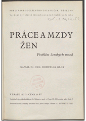 GLOS, Bohuslav. Práce a mzdy žen: problém ženských mezd. V Praze: Sociální ústav ČSR, 1937. 93 stran. Publikace Sociálního ústavu ČSR, číslo 69.