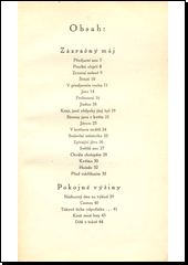 První část sbírky - Zázračný máj: není jen oslavou jara v přírodě, ale je to i radostné přilnutí ke všemu co roste, co žije, v čem tuší ruch světa, tvorbu a čin. V mnohých básních plných náladovosti vytváří básník intimní obraz svého rodného kraje. V druhé části sbírky - Pokojné výšiny: přichází ztišení. Místo předcházejícího jara nastupuje podzim a básník zesiluje složku meditativní a reflexivní. V závěrečném oddílu. - Chvíle pokory: věnovaném Karlu Tomanovi, slyšíme otevřeně přiznání, co trpkých zklamání a zničených ilusí Sova přestál.