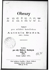 DUDEK, Antonín. Obrazy z přírody. 2. vyd. [Česko]: Dědictví maličkých, 1875. 152 s. Dědictví Maličkých pod ochranou sv. Karla Boromejského v Hradci Králové, č. 15.