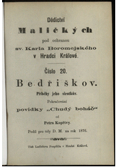 KOPAL, Petr. Bedřiškov: příběhy jeho sirotkův : pokračování povídky "Chudý boháč". V Hradci Králové: Dědictví Maličkých, 1876. 183 s., [4] l. obr. příl. Dědictví Maličkých pod ochranou sv. Karla Boromejského v Hradci Králové, č. 20.