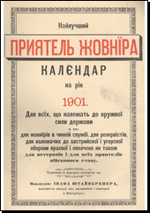 Najlučšij prijatel' žovnjira: kalendar na rik ... : dlja vsjich, ščo nalježat' do oružnoji sili deržavi a to: dlja žovnjiriv v činnij službi, dlja rezervistiv, dlja naležačich do avstrijskoji i ugorskoji oboroni kraevoji i opolčenja jak takož dlja veteraniv i dlja vsjich prijateljiv vijskovogo stanu. V Vinterbergu: Nakladom Ivana Štajnbrenera, [1894-1918].