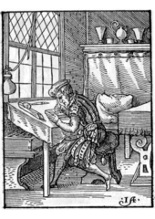 Rok: 1539-1591 Jost Amman (June 13, 1539 – March 17, 1591) was a Swiss-German artist, celebrated chiefly for his woodcuts, done mainly for book illustrations.Amman was born in Zürich, the son of a professor of Classics and Logic. He was himself well-educated. Little of his personal history is known beyond the fact that he moved to Nuremberg in 1560, where took on citizenship and continued to reside until his death in March 1591. He worked initially with Virgil Solis, then a leading producer of book illustrations. His productivity was very remarkable, as may be gathered from the statement of one of his pupils, who said that the drawings he made during a period of four years would have filled a hay wagon. A large number of his original drawings are in the Berlin print room. About 1,500 prints are attributed to him. He was one of the last major producers of woodcuts for books, as during his career engravings were gradually taking over that role. Although like most woodcut artists, he normally let a specialist formschneider cut the block to his drawing, he occasionally included both a cutter's knife and a quill pen in his signature on prints, suggesting he sometimes cut his own blocks.A series of engravings by Amman of the kings of France, with short biographies, appeared in Frankfurt in 1576. He also executed many of the woodcut illustrations for the Bible published at Frankfurt by Sigismund Feierabend, and for a topographical survey of Bavaria by Philipp Apian. Another serial work, the Panoplia Omnium Liberalium Mechanicarum et Seden-tariarum Artium Genera Continens, containing 115 plates, is of great value. Amman's drawing is correct and spirited, and his delineation of the details of costume is minute and accurate. Paintings in oil and on glass are attributed to him, but none have been identified.Amman died in Nuremberg, Bavaria, aged 51. |