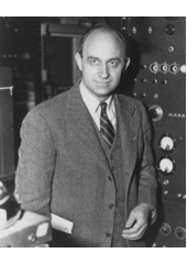 Rok: 1901-1954 Enrico Fermi (Italian: [enˈriko ˈfermi]; 29 September 1901 – 28 November 1954) was an Italian physicist, who is credited with the creation of the first nuclear reactor, the Chicago Pile-1. He made significant contributions to the development of quantum theory, nuclear and particle physics, and statistical mechanics. He is one of the men referred to as the "architect and father of the atomic bomb". Fermi held several patents related to the use of nuclear power, and was awarded the 1938 Nobel Prize in Physics for his work on induced radioactivity by neutron bombardment and the discovery of transuranic elements. He was widely regarded as one of the very few physicists to excel both theoretically and experimentally.Fermi's first major contribution was to statistical mechanics. After Wolfgang Pauli announced his exclusion principle in 1925, Fermi followed with a paper in which he applied the principle to an ideal gas, employing a statistical formulation now known as Fermi–Dirac statistics. Today, particles that obey the exclusion principle are called "fermions". Later Pauli postulated the existence of an uncharged invisible particle emitted along with an electron during beta decay, to satisfy the law of conservation of energy. Fermi took up this idea, developing a model that incorporated the postulated particle, which he named the "neutrino". His theory, later referred to as Fermi's interaction and still later as weak interaction, described one of the four fundamental forces of nature. Through experiments inducing radioactivity with recently discovered neutrons, Fermi discovered that slow neutrons were more easily captured than fast ones, and developed the Fermi age equation to describe this. After bombarding thorium and uranium with slow neutrons, he concluded that he had created new elements; although he was awarded the Nobel Prize for this discovery, the new elements were subsequently revealed to be fission products.Fermi left Italy in 1938 to escape new Italian Racial Laws that affected his Jewish wife Laura. He emigrated to the United States where he worked on the Manhattan Project during World War II. Fermi led the team that designed and built Chicago Pile-1, which went critical on 2 December 1942, demonstrating the first artificial self-sustaining nuclear chain reaction. He was on hand when the X-10 Graphite Reactor at Oak Ridge, Tennessee, went critical in 1943, and when the B Reactor at the Hanford Site did so the next year. At Los Alamos he headed F Division, part of which worked on Edward Teller's thermonuclear "Super" bomb. He was present at the Trinity test on 16 July 1945, where he used his Fermi method to estimate the bomb's yield.After the war, Fermi served under J. Robert Oppenheimer on the influential General Advisory Committee, which advised the Atomic Energy Commission on nuclear matters and policy. Following the detonation of the first Soviet fission bomb in August 1949, he strongly opposed the development of a hydrogen bomb on both moral and technical grounds. He was among the scientists who testified on Oppenheimer's behalf at the 1954 hearing that resulted in the denial of the latter's security clearance. Fermi did important work in particle physics, especially related to pions and muons, and he speculated that cosmic rays arose through material being accelerated by magnetic fields in interstellar space. Many awards, concepts, and institutions are named after Fermi, including the Enrico Fermi Award, the Enrico Fermi Institute, the Fermi National Accelerator Laboratory, the Fermi Gamma-ray Space Telescope, the Enrico Fermi Nuclear Generating Station, and the synthetic element fermium (one of just over a dozen elements named after people). |
