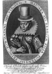 Rok: -1617 Pocahontas (narozená Matoaka, později známá jako Rebecca Rolfe; okolo 1595 – březen 1617) byla virginijská indiánka, která je známá především svoji aktivitou během časů prvních anglických kolonií v Jamestownu. Byla dcerou Powhatana, náčelníka společenství indiánských kmenů ve východní Virginii. Pocahontas je přisuzována záchrana zajatce Johna Smithe v roce 1607, když zabránila svému otci popravit jej položením vlastní hlavy na hruď zajatce. Dodnes se neví, jestli jde o skutečnou událost, nebo zda si jí John Smith vymyslel. Ve svých prvních cestopisech vydaných krátce po předpokládané záchraně (1608, 1612) se o ní totiž nezmínil a učinil tak až poté, kdy se Pocahontas stala velmi populární díky své návštěvě Anglie. V roce 1613 se Pocahontas dostala do anglického zajetí (právě probíhala první anglo-powhatanská válka) a byla držena pro výkupné. Během zadržování se nechala pokřtít a přijala nové jméno Rebecca. Když získala možnost odejít zpět k vlastním lidem, rozhodla se zůstat s Angličany. V roce 1614 si vzala anglického pěstitele tabáku Johna Rolfa a jejich svatba se stala prvním uskutečněným sňatkem mezi bělochem a Indiánkou v americké historii. S Johnem Rolfem měla syna Thomase. V roce 1616 odcestovala s rodinou do Londýna, kde byla prezentována lidem jako výsledek "zcivilizovaného divošství", za účelem zvýšení investic v Jamestownu. V Anglii se stala celebritou, ovšem v roce 1617 na cestě zpět do Ameriky zemřela za nejasných okolností na lodi u Gravesendu v Kentu. Byla pohřbena v místním kostele. Přesné umístění jejího hrobu je však neznámé. |