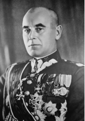Rok: 1886-1941 Maršál Edward Śmigły-Rydz, někdy také Edward Rydz-Śmigły, pseud. Śmigły, Tarłowski či Adam Zawisz (11. března 1886, Berežany – 2. prosince 1941, Varšava) byl polský voják, politik a umělec. Bojoval v první světové válce, polsko-sovětské válce a druhé světové válce. Roku 1935 nahradil Józefa Piłsudského ve funkci generálního inspektora polských ozbrojených sil a z titulu této funkce též velel polským silám v jejich odporu při vpádu do Polska v roce 1939. Byl též svobodným zednářem. Kolem jeho osoby byl pěstován v Polsku kult osobnosti. |