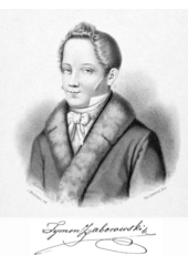 Rok: 1799-1828 Tymon Zaborowski (1799–1828) was a Polish poet. He was influenced at the beginning of his writing career by classicism, then by Romanticism. He is also known, after one of his poems, as "Wieszcz Miodoboru" ("the Bard of the Honey Harvest"). |