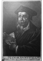 Rok: 1487-1537 Ottmar Luscinius (also called Othmar or Otmar Nachtgall) was an Alsatian Catholic Humanist who wrote Biblical commentaries; b. Strasbourg, 1487, d. Freiburg, 1537. After receiving instruction in Strasbourg from Jacob Wimpheling, he went in 1508 to Paris, where he studied Latin under Faustus Andrelini and Greek under Hieronymus Aleander. He then studied canon law at the Catholic University of Leuven, in Padua, and Vienna, and in the last city music also under Wolfgang Grefinger. Subsequently he travelled in Greece and Asia Minor, returning to Strasbourg in 1514. Here he became associated with Wimpheling and Sebastian Brant and mingled in literary circles. In 1515 he was appointed organist at the church of St. Thomas, and also received a vicariate, as he was a priest. In addition he taught both in the school of the Knights Hospitallers and in the cathedral school. He spread in Strasbourg his own enthusiasm for the Greek language and literature, and published Greek manuals, collections of examples, and an edition of Lucian with a translation. In 1515 he also published a book on the elements of music (Institutiones musicae), and in 1516 issued a revised edition of the Rosella of Baptista Trovamala's compendium of cases of conscience. Luscinius went to Italy and there received the degree of Doctor of Law. In 1520 he lost his position at St. Thomas's, and failed to obtain a prebend which he had expected, but he was soon made a canon of St. Stephen's in Strasbourg. In 1523 he went to Augsburg, and there became a teacher of the Bible and of Greek at the monastery of St. Ulrich. Although a zealous Humanist and an opponent of Scholasticism, Luscinius did not become a supporter of the Protestant Reformation. For a time, however, he certainly seems to have been friendly to it, and to have approved of the doctrine of salvation by faith alone. But he held such disputes to be specious quibbling over words, and thus at the beginning he avoided taking sides. After 1525, however, he was regarded as a reliable Catholic. The Fugger family made him preacher at the church of St. Moritz, and he became the most important champion of Catholicism in Augsburg, his sermons arousing the ill-will of the Protestants. In 1528, after he had repeatedly called the Evangelical preachers heretics, he was arrested and confined to his own house. In 1529 he was made cathedral preacher in Freiburg im Breisgau. Towards the end of his life he wished to enter the Carthusian monastery near Freiburg, but he was prevented by death. |