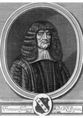 Rok: 1597-1677 Francis Glisson (1599? – 14 October 1677) was a British physician, anatomist, and writer on medical subjects. He did important work on the anatomy of the liver, and he wrote an early pediatric text on rickets. An experiment he performed helped debunk the balloonist theory of muscle contraction by showing that when a muscle contracted under water, the water level did not rise, and thus no air or fluid could be entering the muscle. Glisson was born in Bristol and was educated in Rampisham, Dorset, and at Caius College, Cambridge. Glisson is a well-known medical eponym; he was for forty years Regius Professor of Physic at Cambridge. He died in London. The Glisson family can be traced to present-day Somerset. |