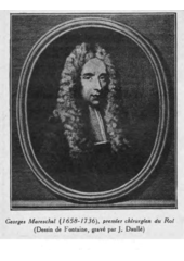 Rok: 1658-1736 Georges Mareschal (8 April 1658, Calais – 13 December 1736, Château de Bièvres) was a French surgeon. In 1707 he was ennobled, and was known as Georges Mareschal, seigneur de Bièvre.He was the son of John Marshall, an Irish gentleman who was knighted in 1643 for his service during the Battle of Rocroi. In 1677 Mareschal moved to Paris, where he worked as a surgical assistant. From 1684 onward, he worked at the Hôpital de la Charité, where in 1688 he became master-surgeon, later earning the title of chief-surgeon (1692).He was first-surgeon to Louis XIV and then to Louis XV. In 1723 he was awarded the Ordre de Saint-Michel for successfully treating the Infanta of Spain. In 1731, with François Gigot de la Peyronie (1678–1747), he founded the Académie Royale de Chirurgie. He is credited with making improvements in lithotomical surgery. |