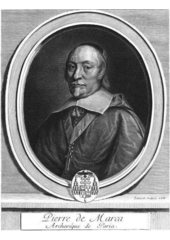 Rok: 1594-1662 Pierre de Marca (24. ledna 1594 v Gan – 29. června 1662 v Paříži) byl francouzský právník, historik, římskokatolický kněz, biskup v Couserans (1642-1652) a arcibiskup v Toulouse (1652-1662). Byl jmenován též arcibiskupem pařížským, ale zemřel ještě před nástupem do funkce. |