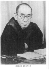 Rok: 1870-1945 Kitarō Nishida (西田 幾多郎, Nishida Kitarō, May 19, 1870 – June 7, 1945) was a prominent Japanese philosopher, founder of what has been called the Kyoto School of philosophy. He graduated from The University of Tokyo during the Meiji period in 1894 with a degree in philosophy. He was named professor of the Fourth Higher School in Ishikawa Prefecture in 1899 and later became professor of philosophy at Kyoto University. Nishida retired in 1927. Later in his retirement, in 1940, he was awarded the Order of Culture (文化勲章, bunka kunshō). He participated in establishing the (千葉工業大学, Chiba Institute of Technology) from 1940. Nishida Kitarō died at the age of seventy-five of a renal infection. His grave is located at Reiun'in (霊雲院, Reiun'in), a temple in the Myōshin-ji compound in Kyoto. |