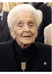 Rok: 1909-2012 Rita Leviová-Montalciniová, (22. dubna 1909 Turín – 30. prosince 2012, Řím) byla italská neuroložka židovského původu, objevitelka nervového růstového faktoru. Je považována za jednu z nejvýznamnějších neuroložek 20. století, obdržela ta nejprestižnější ocenění ve svém oboru, včetně Albert Lasker Award for Basic Medical Research a Nobelovy ceny za fyziologii a lékařství (obě v roce 1986 spolu se Stanleym Cohenem). Byla členkou Papežské akademie věd (nominována v roce 1974) a Národní akademie věd Spojených států amerických (od 1968), rytířkou velkokříže Řádu zásluh o Italskou republiku (od 1987) a doživotní senátorkou Itálie (od 2001). Až do jejího úmrtí šlo o nejstarší žijící nositelku Nobelovy ceny a o jediného laureáta v historii, který se dožil 100 let věku. |