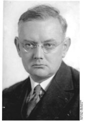 Rok: 1882-1947 Ernst Krieck (6 June 1882, Vögisheim – 19 March 1947, Moosburg an der Isar) was a German educationalist who served as the Rector of Goethe University Frankfurt during the Nazi era. He was a professor of pedagogy at the Frankfurt University.He joined the Nazi Party in 1932 and served with the National Socialist Teachers League before in 1934 working with the Sicherheitsdienst. He joined the Schutzstaffel in 1938 and eventually obtained the honorary rank of Obersturmbannführer.Krieck was a passionate supporter of "German Physics," a nationalist trend which believed that the German people must develop their own scientific philosophy and methods, particularly to avoid the perceived stain of Jewish influence. |
