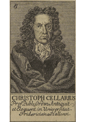 Rok: 1638-1707 Christoph (Keller) Cellarius (22 November 1638 – 4 June 1707) was a German classical scholar from Schmalkalden who held positions in Weimar and Halle. Although the Ancient-Medieval-Modern division of history was used earlier by Italian Renaissance scholars Leonardo Bruni and Flavio Biondo, Cellarius' Universal History Divided into an Ancient, Medieval, and New Period helped popularize it. After him, this tripartite division became standard.The library of the University of Applied Sciences in Schmalkalden bears his name, it is called the "Cellarius Bibliothek", in honor of Cellarius. |