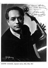 Rok: 1897-1966 Gaspar Cassadó i Moreu (30 September 1897 – 24 December 1966) was a Spanish cellist and composer of the early 20th century. He was born in Barcelona to a church musician father and began taking cello lessons at age seven. When he was nine, he played in a recital where Pablo Casals was in the audience; Casals immediately offered to teach him. The city of Barcelona awarded him a scholarship so that he could study with Casals in Paris.He was also the author of several notable musical hoaxes.The personal papers of Cassadó family are preserved in the Biblioteca de Catalunya. |